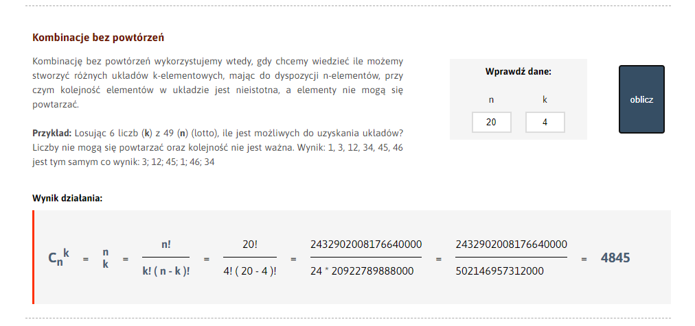 Więc w takim wypadku jest 4845 kombinacji liczb.